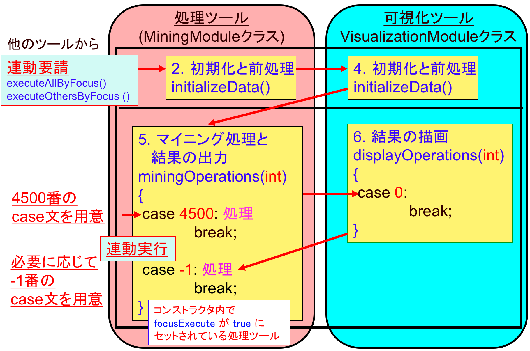 - 可視化ツール内で,スーパークラスで用意されている以下のメソッドを呼び出すことで,コンストラクタ内で focusExecute を true に設定している処理ツールの処理を再実行(initializeData() と miningOperations()のcase 4500: ならびに,ペアとなっている可視化ツールの initializeData(),displayOperations()のcase 0: を実行)します.