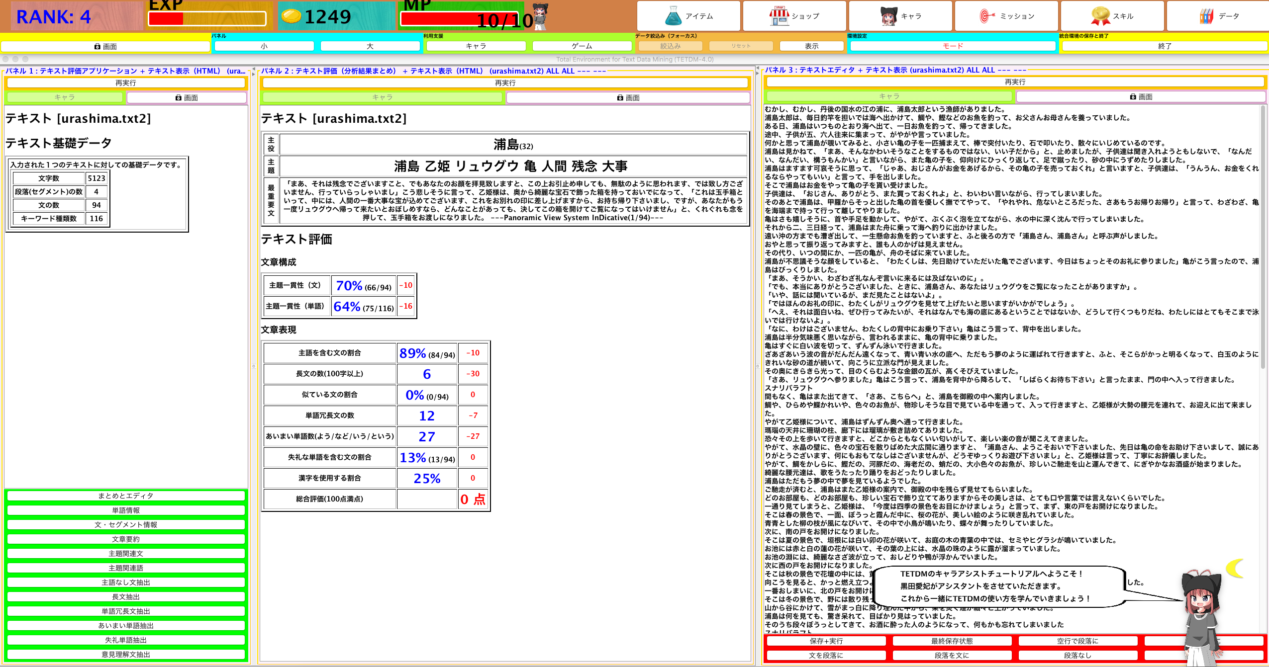 図1:「浦島太郎」の文章を,エディタで「文を段落に」して,「単語情報」から単語「浦島」の情報を確認した結果(クリックで拡大)