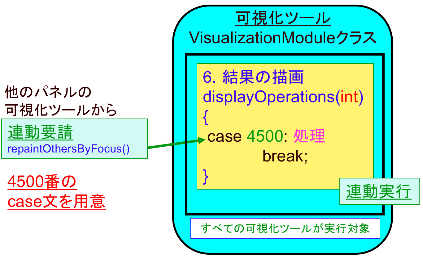 - 可視化ツール内で,スーパークラスで用意されている以下のメソッドを呼び出すことで,他の可視化ツールの表示を更新( displayOperations()のcase 4500: を実行)します